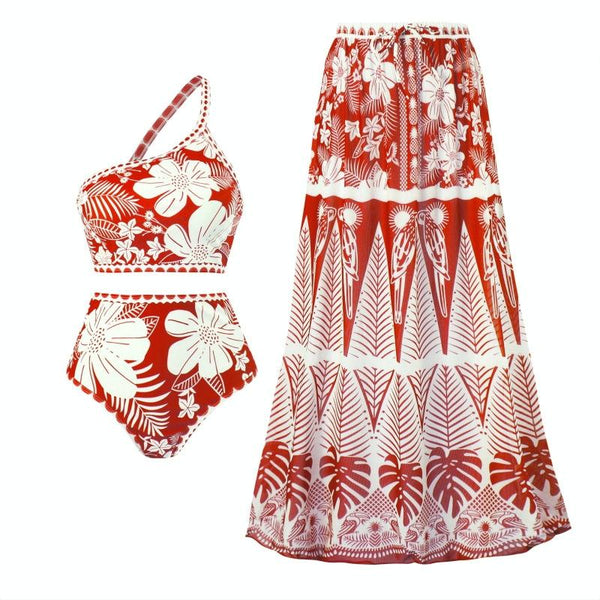 Retro Split Sexy One-Shoulder Swimsuit Chiffon Beach Skirt Swimsuit, Size: XL(Red Suit)