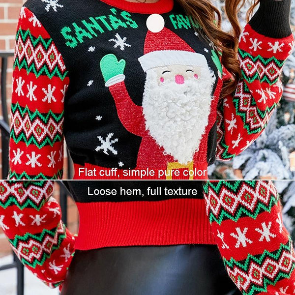 Santa Claus Embroidered Sweater Women Cute Pullover Short Sweater, Size: S(Black)