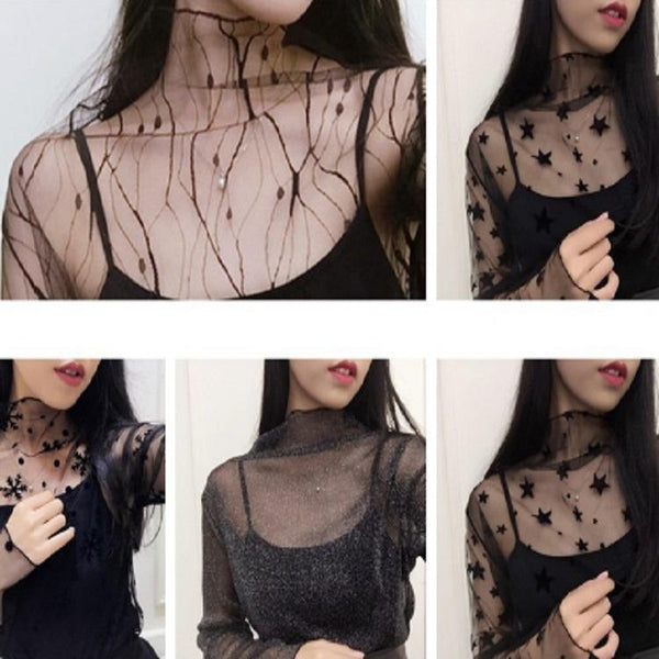 Sexy Mesh High Collar Long Sleeve Bottoming Blouse, Size:One Size( Snowflake)