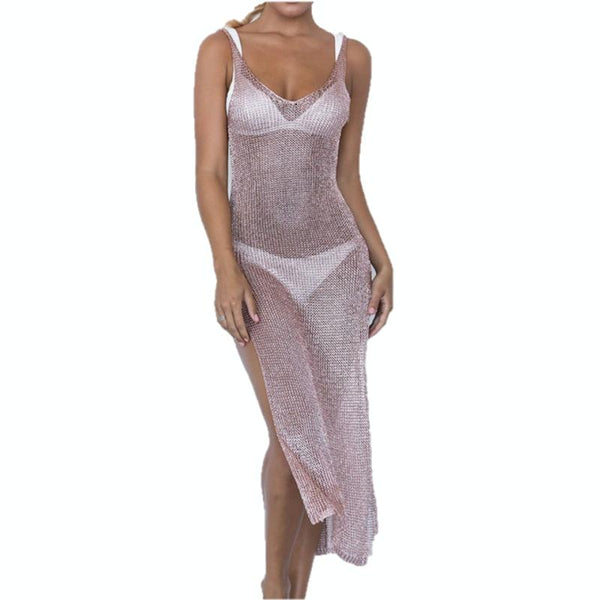 Sexy Perspective Mesh Gauze Strap Dress Swimsuit Cover-up, Size:L(Silver)