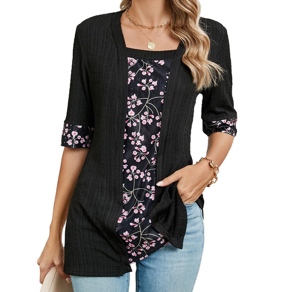 Spring Summer Printed Fake Two-Piece Square Neck Mid-Sleeve Top T-Shirt, Size: XXL(Black)