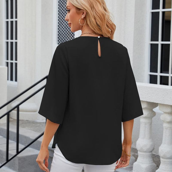 Summer Women Loose Chiffon Blouse Tops Round Neck 5 Points Sleeve Short Sleeve, Size: L(Black)