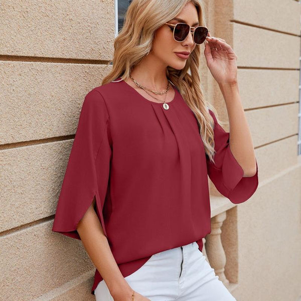 Summer Women Loose Chiffon Blouse Tops Round Neck 5 Points Sleeve Short Sleeve, Size: XXL(Wine Red)