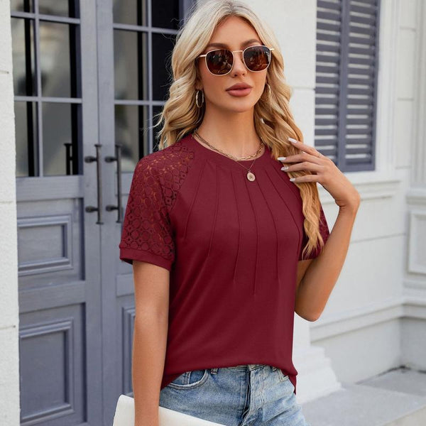 Summer Women Round Neck Flower Lace Patchwork Short Sleeve T-Shirt, Size: L(Wine Red)