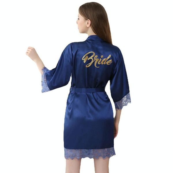 Women Bride Gold Lettering Lace Edge Nightgown, Size:S(Dark Blue)