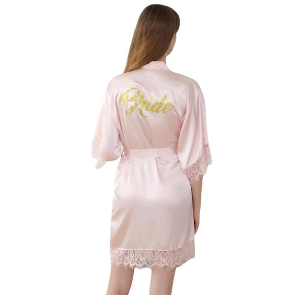 Women Bride Gold Lettering Lace Edge Nightgown, Size:S(Light Pink)
