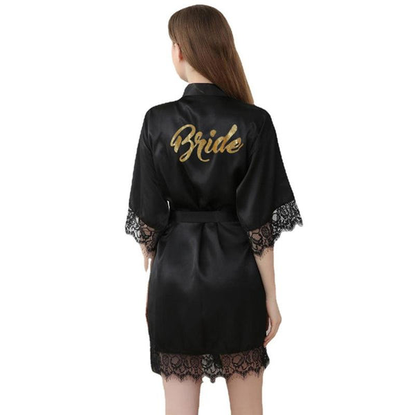 Women Bride Gold Lettering Lace Edge Nightgown, Size:XL(Black)