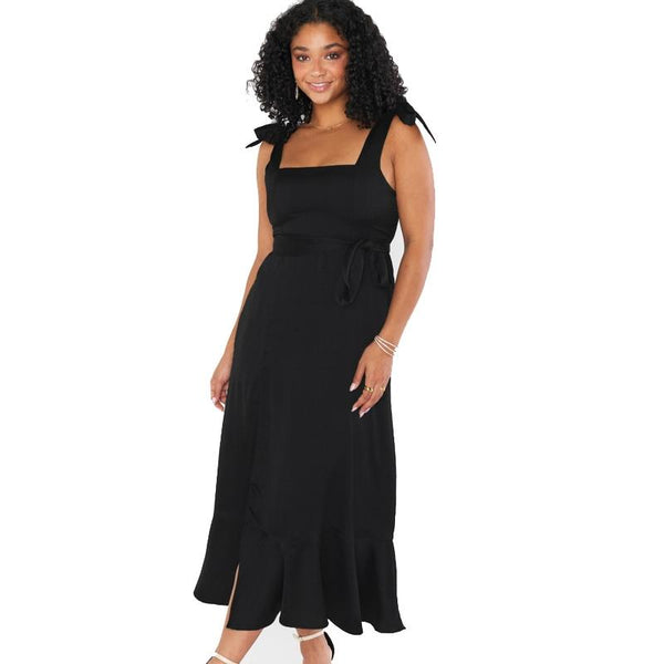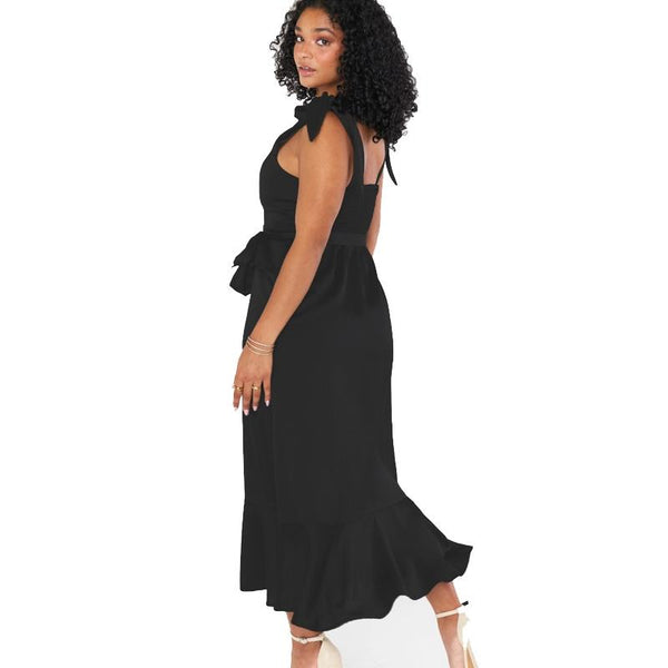 3. This elegant formal dress features a square neckline, adjustable self-tie straps, tie waist and pleated back to fit a variety of bust sizes
