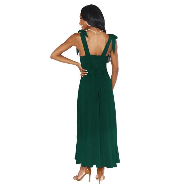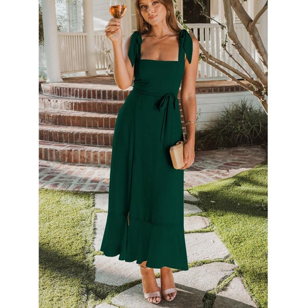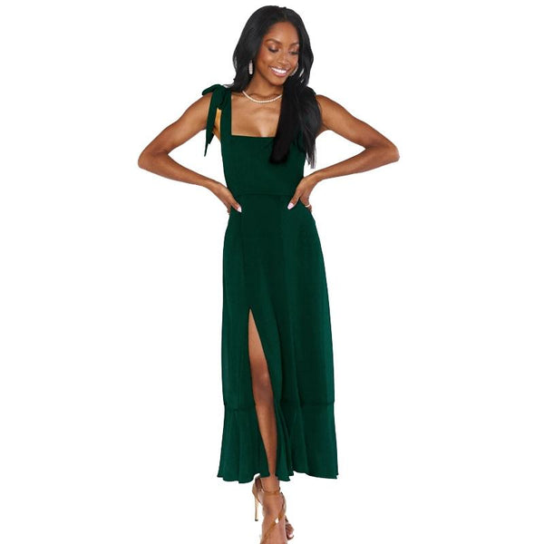 Women Elegant Slit Dress Commuting Sleeveless Knot Suspender Dress, Size: XL(Dark Green)