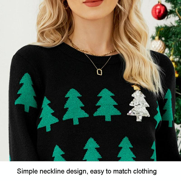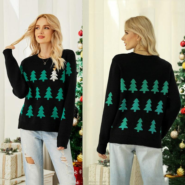Women Pullover Jacquard Christmas Tree Knitwear Long Sleeve Knit Sweater, Size: M(Black)