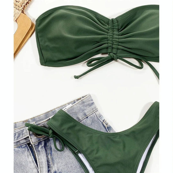 WomenSexy Lace Up Bandeau Two Pieces Set Bikini Drawstring Tie Side Swimsuit Swimwear, Size: L(Green)