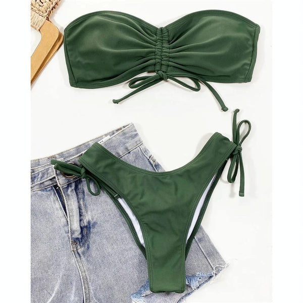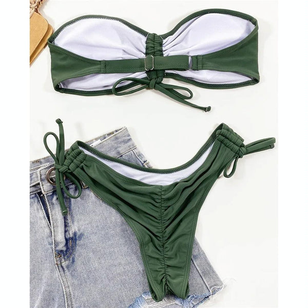 3. Two-piece set: This set includes a bandeau top and matching bottoms, both designed to create a cohesive and stylish beach look.