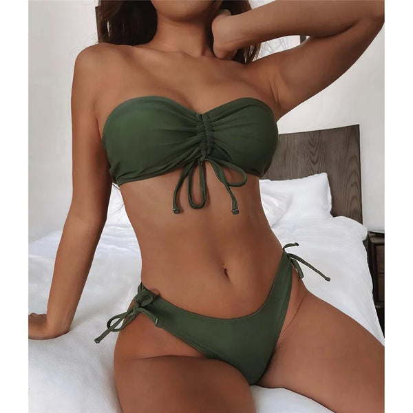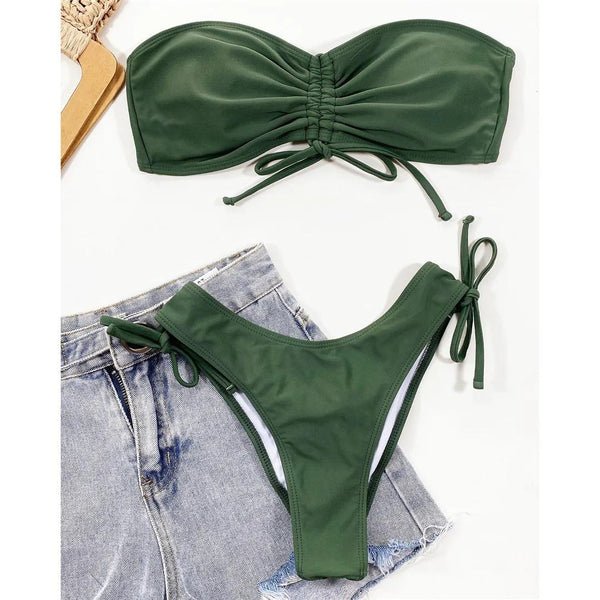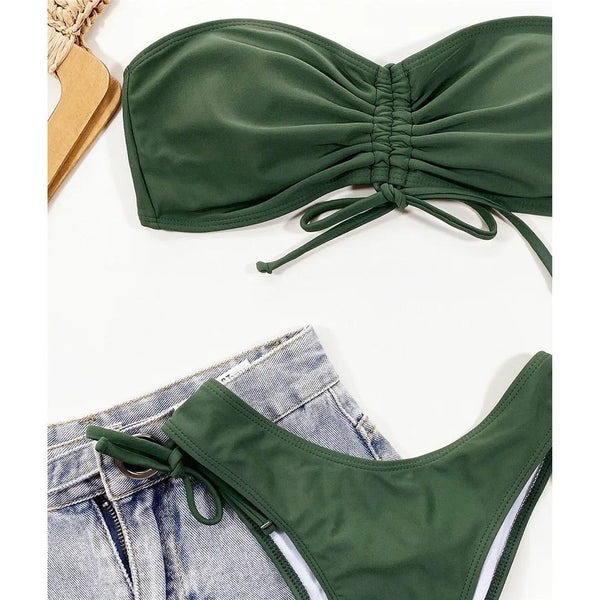 WomenSexy Lace Up Bandeau Two Pieces Set Bikini Drawstring Tie Side Swimsuit Swimwear, Size: M(Green)