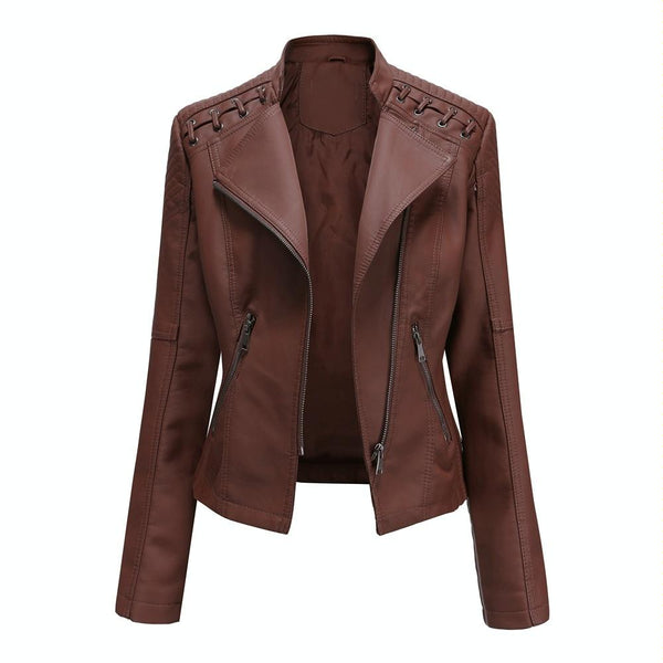 Women Short Leather Jacket Slim Jacket Motorcycle Suit, Size: M(Coffee)