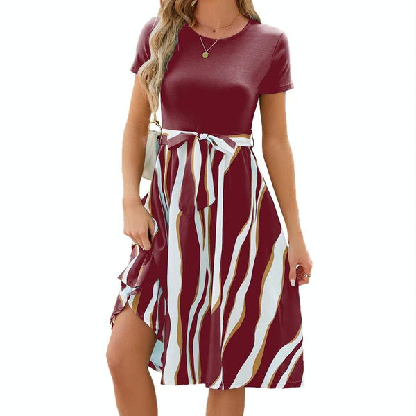 Women Spring Summer Round Neck Splicing Printed Short Sleeve Big Hem Dress, Size: XL(Wine Red)