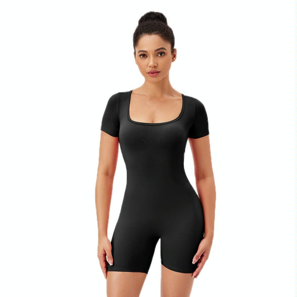 Women Square Neck Tight Quick-drying Yoga Short-sleeved Jumpsuit, Size: M(Black)