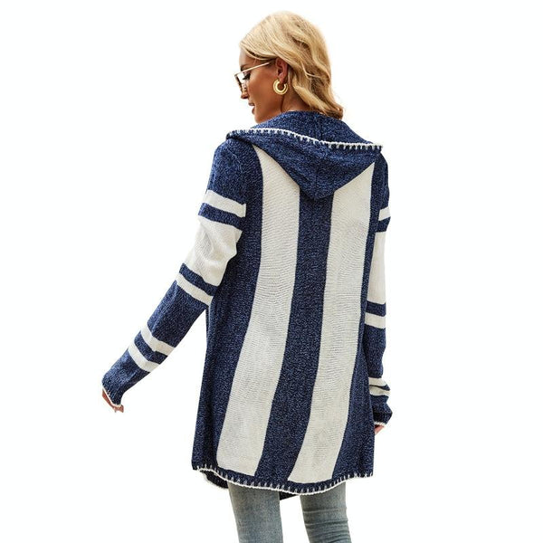 Women Striped Hooded Knit Cardigan Irregular Long-sleeved Sweater Jacket, Size: M(Blue and White)
