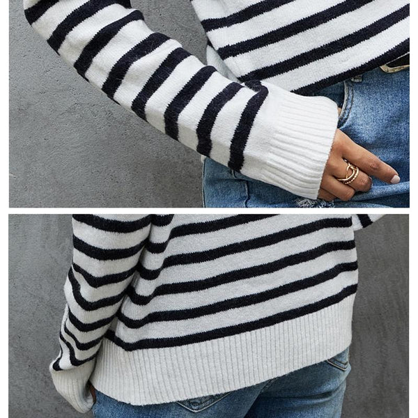 Women Striped Knitwear Loose Stand-up Collar Pullover Sweater, Size: S(Black and White)