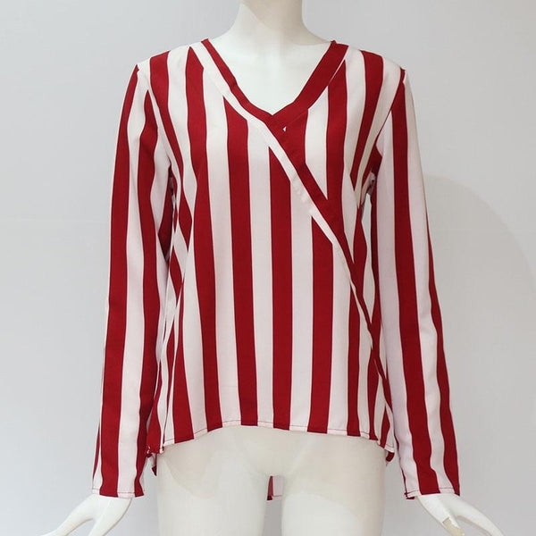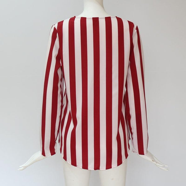 Women Striped Shirt Long Sleeve V-neck Shirts Casual Tops Blouse, Size:XXXL(Red)