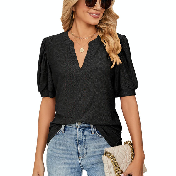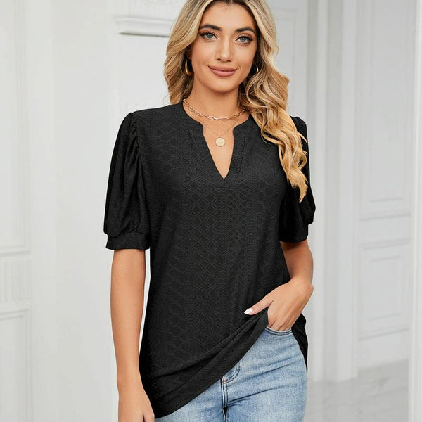 Women Summer Casual V-Neck Hollow Bubble Sleeve Loose T-Shirt, Size: L(Black)