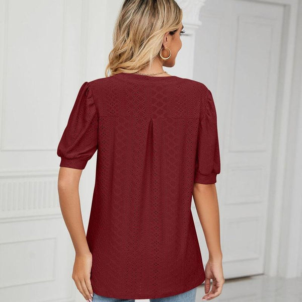 Women Summer Casual V-Neck Hollow Bubble Sleeve Loose T-Shirt, Size: XXL(Wine Red)