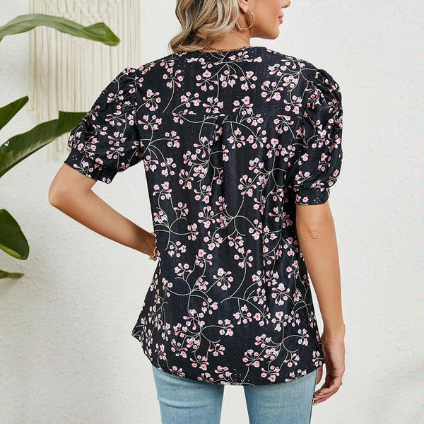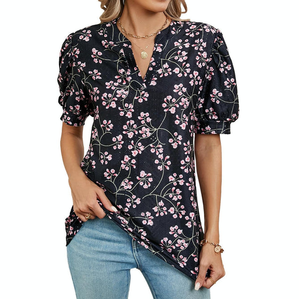 Women V-neck Loose Short-sleeved Printed T-shirt Top, Size: M(Cherry Blossom)