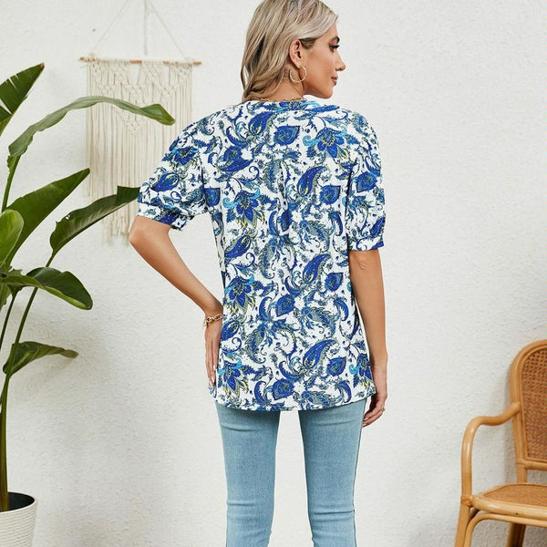 Women V-neck Loose Short-sleeved Printed T-shirt Top, Size: XXL(Blue Cashew)