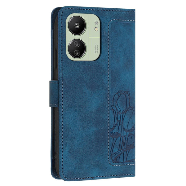 For Redmi 13C 4G / 5G Tulips Embossed Leather Phone Case with Lanyard(Blue)