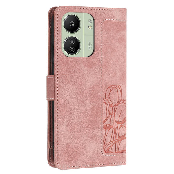 For Redmi 13C 4G / 5G Tulips Embossed Leather Phone Case with Lanyard(Pink)