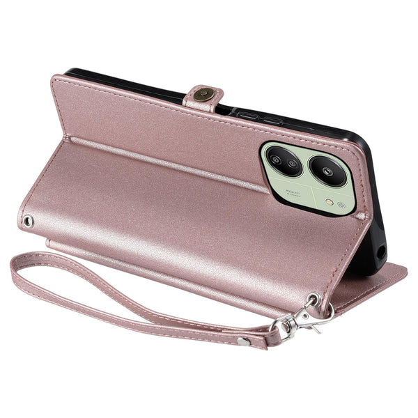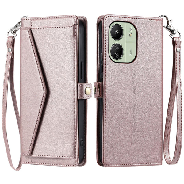 For Redmi 13C 4G / 5G Wallet Multi-card Slot Leather Phone Case with Lanyard(Rose Gold)