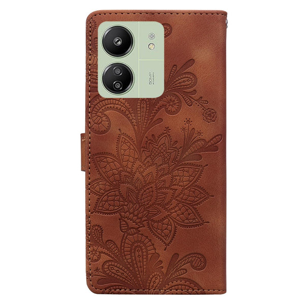 For Redmi 13C Lace Floral Embossed Magnetic Buckle PU Phone Case With Wrist Strap(Brown)