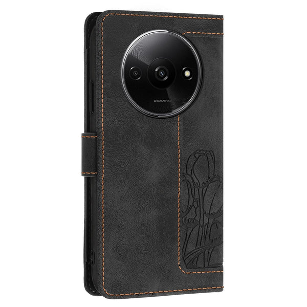 For Redmi A3 Tulips Embossed Leather Phone Case with Lanyard(Black)