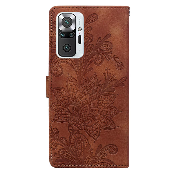 For Redmi Note 10 Pro 4G Lace Floral Embossed Magnetic Buckle PU Phone Case With Wrist Strap(Brown)
