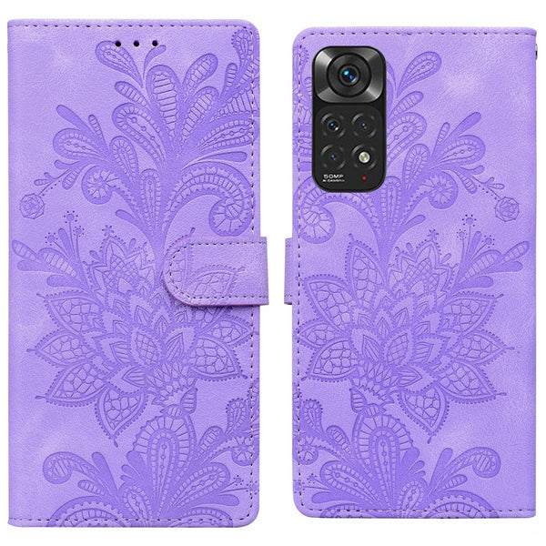 For Redmi Note 11 Global Lace Floral Embossed Magnetic Buckle PU Phone Case With Wrist Strap(Purple)