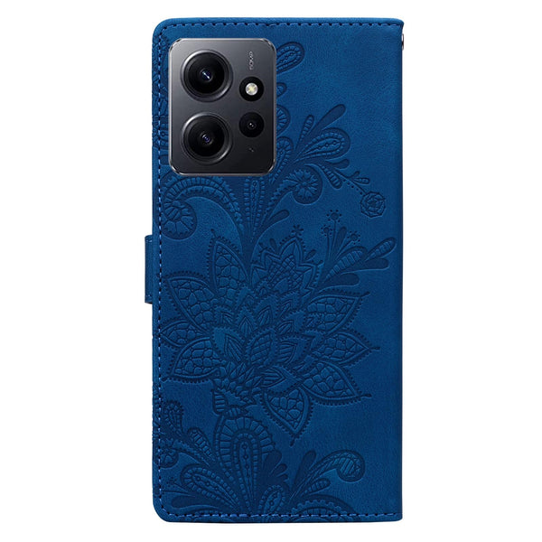For Redmi Note 12 4G Global Lace Floral Embossed Magnetic Buckle PU Phone Case With Wrist Strap(Blue)