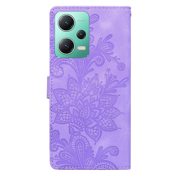 For Redmi Note 12 5G Global Lace Floral Embossed Magnetic Buckle PU Phone Case With Wrist Strap(Purple)
