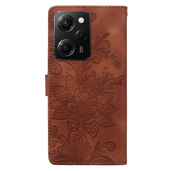 For Redmi Note 12 Pro 5G Global Lace Floral Embossed Magnetic Buckle PU Phone Case With Wrist Strap(Brown)