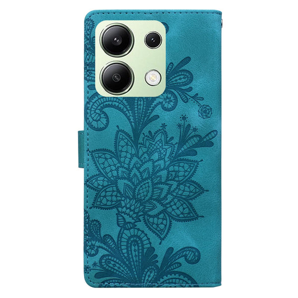 For Redmi Note 13 4G Lace Floral Embossed Magnetic Buckle PU Phone Case With Wrist Strap(Green)