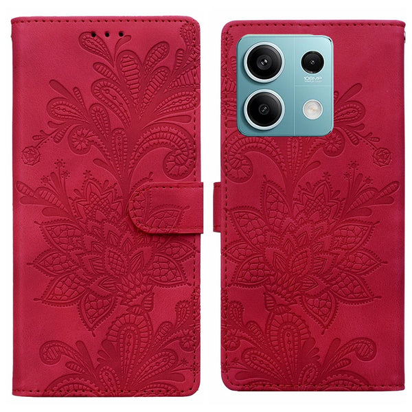 For Redmi Note 13 5G Lace Floral Embossed Magnetic Buckle PU Phone Case With Wrist Strap(Red)