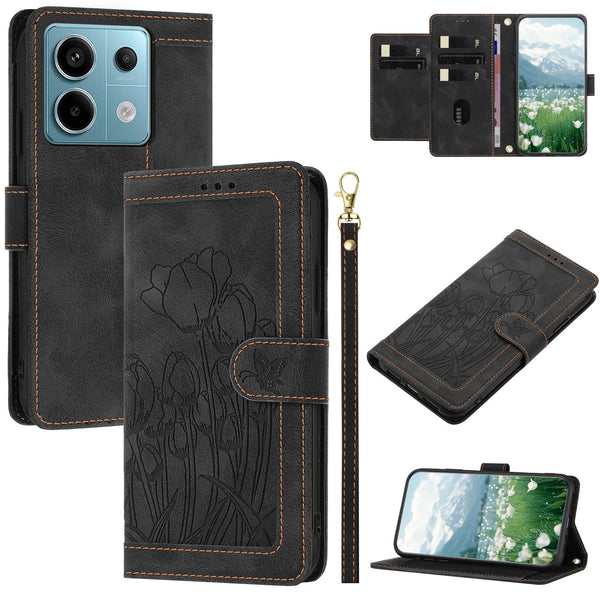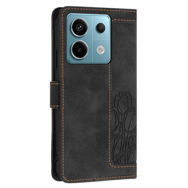 For Redmi Note 13 5G Tulips Embossed Leather Phone Case with Lanyard(Black)