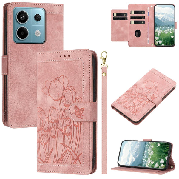 For Redmi Note 13 5G Tulips Embossed Leather Phone Case with Lanyard(Pink)
