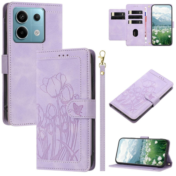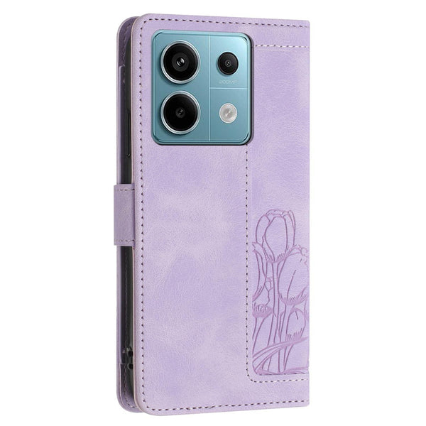For Redmi Note 13 5G Tulips Embossed Leather Phone Case with Lanyard(Purple)