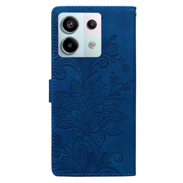For Redmi Note 13 Pro 4G Lace Floral Embossed Magnetic Buckle PU Phone Case With Wrist Strap(Blue)