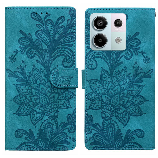 For Redmi Note 13 Pro 5G Lace Floral Embossed Magnetic Buckle PU Phone Case With Wrist Strap(Green)