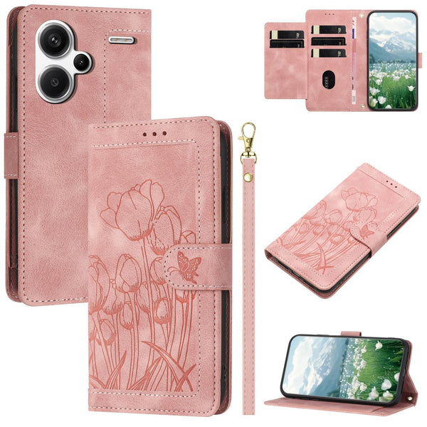 For Redmi Note 13 Pro+ 5G Tulips Embossed Leather Phone Case with Lanyard(Pink)