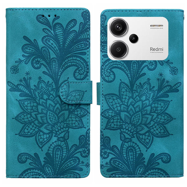 For Redmi Note 13 Pro+ Lace Floral Embossed Magnetic Buckle PU Phone Case With Wrist Strap(Green)