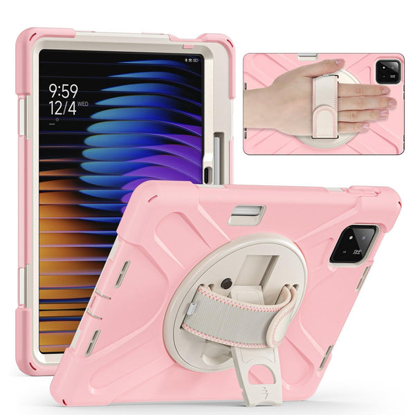 For Xiaomi Pad 7 / 7 Pro Rotatable Holder Silicone Hybrid PC Tablet Case with Shoulder Strap(Cherry Blossom Pink)
