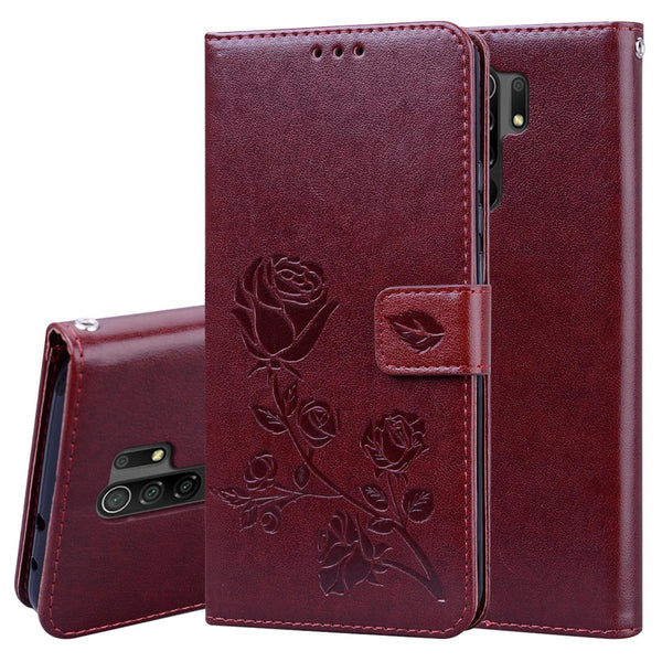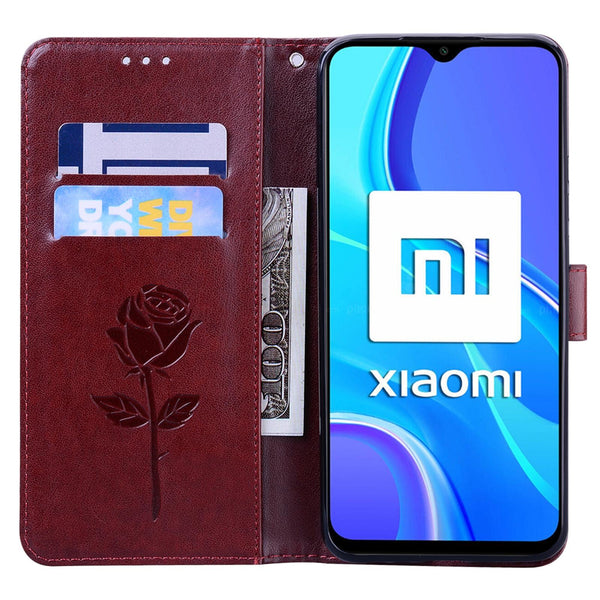 For Xiaomi Redmi 9 Rose Embossed Horizontal Flip PU Leather Case with Holder & Card Slots & Wallet(Brown)