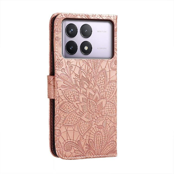 For Xiaomi Redmi K70 Lace Flower Embossing Flip Leather Phone Case(Rose Gold)
