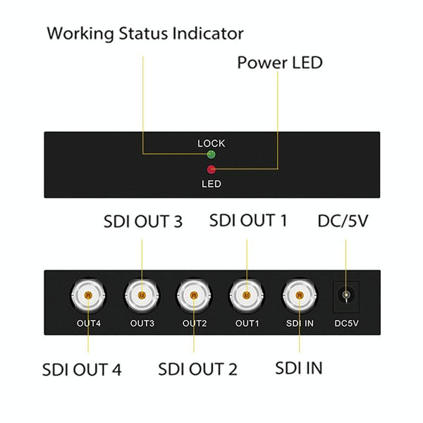 1. SDI distribution function: Connect the hardware according to the three "installation steps", and the SDI splitter will start to work normally. The SDI splitter supports SD-SDI (270Mbps), high-definition HD-SDI (1.485Gbps) and full high-definition 3G-SDI (2.97 Gbps) video format, SDI video distribution